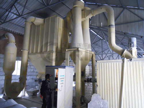 選粉機(jī)內(nèi)旋轉(zhuǎn)的葉輪使粗物料回落重磨,符合要求的細(xì)粉則隨氣流進(jìn)入旋風(fēng)集粉器并由其下部的卸料閥排出即為成品,而帶有少量細(xì)粉塵的氣流則經(jīng)過(guò)脈沖除塵器凈化后通過(guò)風(fēng)機(jī)和消聲器排出。